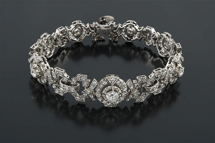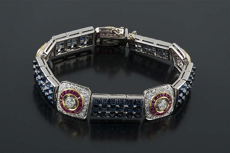 Destacamos dos pulseras. La pulsera del lote 125 está realizada en oro bicolor; está formada por piezas cuadradas con cinco diamantes centrales de talla brillante con un peso aproximado de 2,40 cts, orlados por rubíes calibrados con un peso aproximado 3,75 cts. Entre estas piezas vemos otras, de unión, conformadas por zafiros de talla cabujón, con un peso total de 17,1 cts. Sale a la venta por un precio de 3750€ (ver). El lote 232 es una pulsera de los años 50, realizada en platino y formada por motivos geométricos con diamantes talla brillante, brillante antigua y 8/8, con un peso total de 6,25 cts. Sale a la venta por 4750€ (ver).