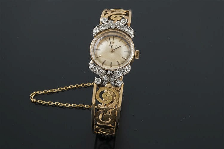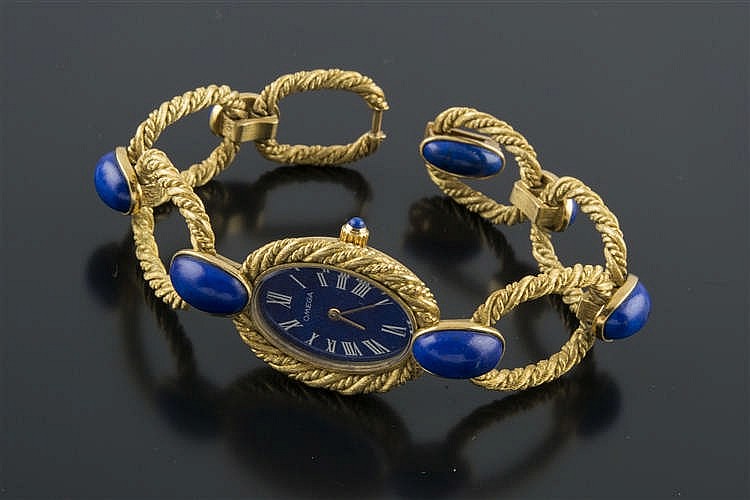 En cuanto a relojes, el lote 388 es un reloj joya Omega, realizado en oro para señora. La caja es ovalada y la esfera es de lapislázuli, con numeración romana y agujas tipo bastón, mientras que el brazalete está formado por motivos ovalados de cordoncillo dispuestos en disminución y separados por piezas de lapislázuli de talla cabujón oval. Sale a subasta por 1.200€ (ver). El segundo reloj es el lote 387, también un reloj Omega, en este caso de los años 60. Está realizado en oro para señora y presenta caja redonda con motivos realizados en platino a ambos lados, cuajados por diamantes en talla brillante y cristal facetado. La esfera es de color beige, la numeración baquetonada y las agujas esmaltadas en negro, con el brazalete rígido de oro con decoración calada vegetal. Sale a subasta por 950€ (ver).