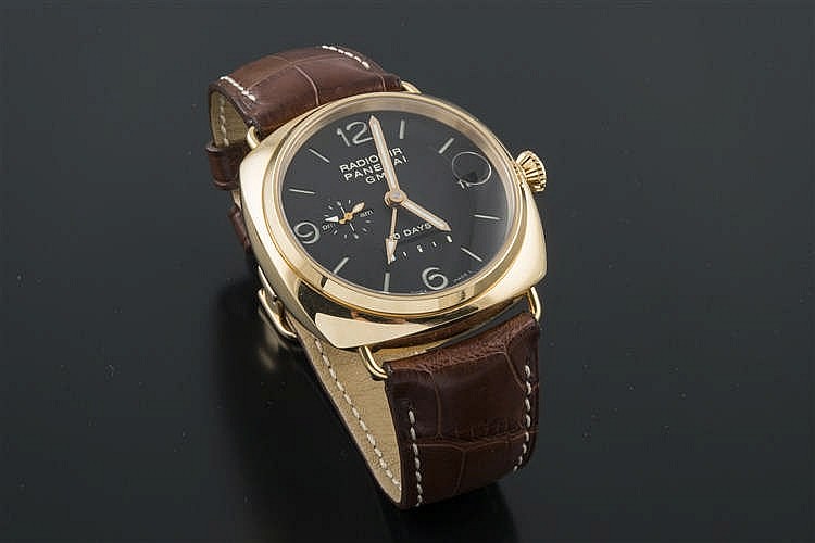 El segundo es un reloj Panerai modelo Officine GMT 10 days, realizado en oro para caballero con caja redonda y bisel liso. Posee indicador de 24 horas, y la esfera en color negro con, una vez más, numeración mixta: arábiga y baquetonada. Las agujas son tipo bastón luminiscente, con ventana para calendarios a las 3h. El indicador de reserva de marcha lineal está situado a las 6h, y el segundero y el indicador de 24 horas a las 9h. La pulsera es original, de piel y con cierre oculto desplegable realizado en oro. Su número de registro es el nº BB1230832. Saldrá a subasta por 19.000€ (ver).