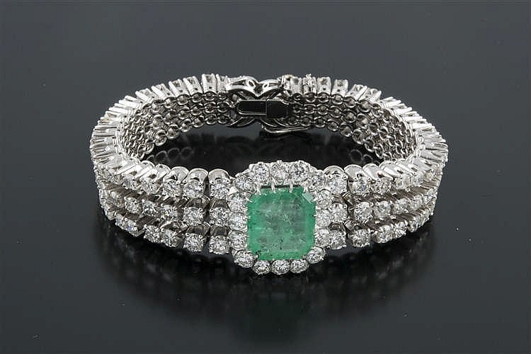 Continuando con las sortijas tenemos una sortija realizada en oro blanco con una esmeralda en talla cuadrada, de 10,75 cts, orlada con diamantes en talla marquisse, de 4 cts. Saldrá a subasta por 16.000€ (ver). Hace juego con otras destacadas piezas de la subasta, como es esta pulsera de oro blanco y esmeralda, compuesta por tres bandas y una orla central de diamantes en talla brillante, brillante antigua y 8/8 dispuestos en disminución, 16,17 cts de peso total. La esmeralda que presenta es de talla esmeralda, con un peso de 8,07 cts. Saldrá a subasta por 9.500€ (ver). Y por último, completando el juego, vemos estos pendientes de oro blanco con dos esmeraldas centrales, de peso total 8,34 cts, orladas a su vez por diamantes de talla brillante de 0,87 cts. Saldrán por 9.500€ (ver).