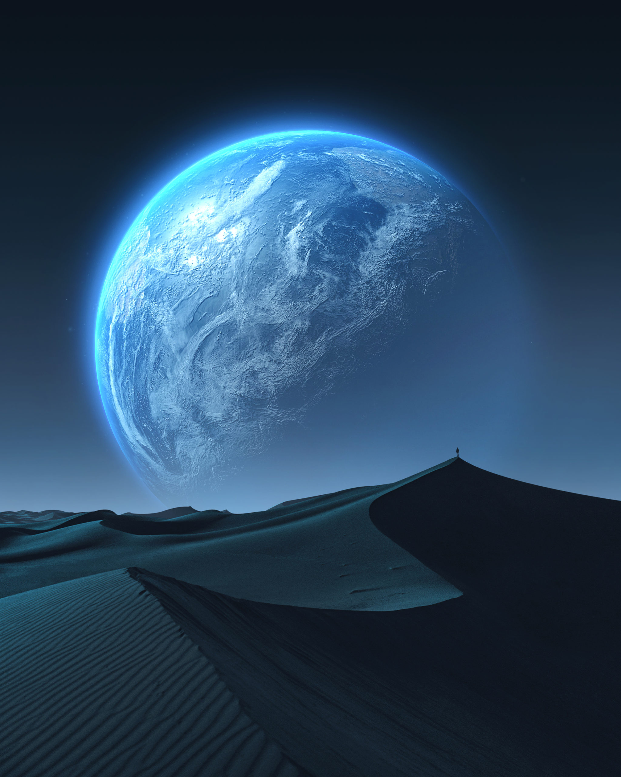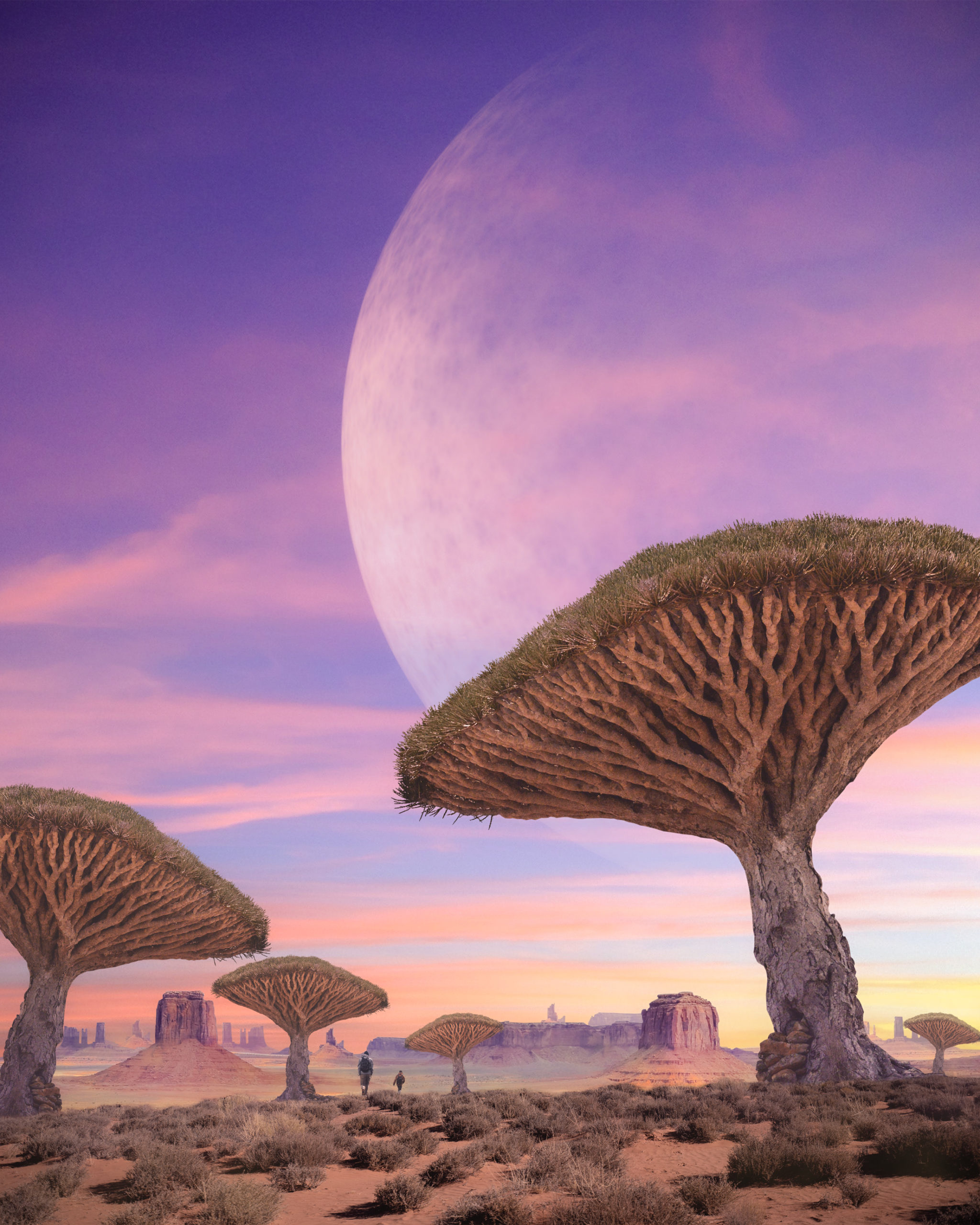 Talking about the process, I start with a blank environment in Blender and World Creator. The first step involves going through World Creator and creating a great landscape for the artwork and then applying the right textures and colour data. Right after, I export all the necessary files from World Creator to Blender – where I lay down the landscape, vegetation, sky, human figure, lighting and all other necessary bits to add realism to my scene! Lastly, I render out the scene and pull that into Photoshop, where I do the post-processing work – exposure, colour grading, corrections etc.