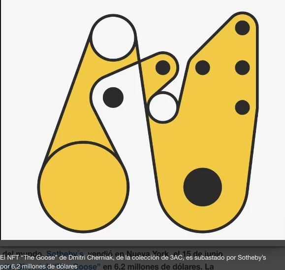 La casa de subastas más importante del mundo, Sotheby´s, vendió en Nueva York el 15 de junio en una subasta la obra de arte de Dimitri Cherniak “The Goose” en 6,2 millones de dólares. La pieza NFT (token no fungible) pertenecía a la colección de la empresa declarada en bancarrota 3AC (Three Arrows Capital).