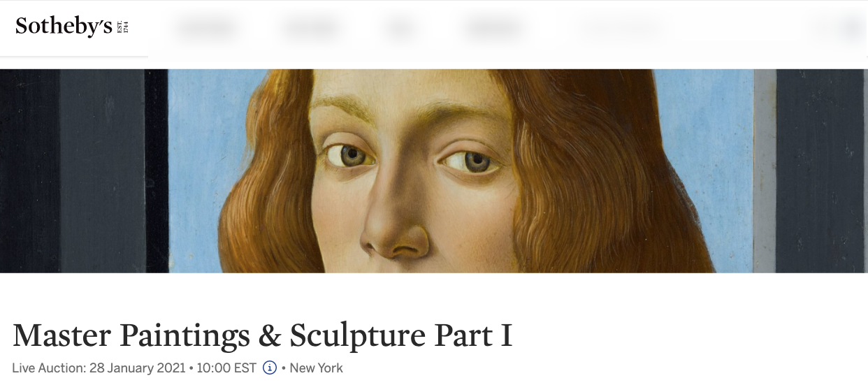 Las cosas se mueven rápido, el balance del 2020 en el sector arte y subastas ya está hecho, y toca continuar con el “business as usual”, a pesar de la Pandemia y el distanciamiento social. Sotheby´s dispara primero, ¡y de qué manera!, se atreve con una subasta híbrida, semipresencial, en Nueva York: el 28 de enero celebran la venta “Master Paintings and Scupture” con obras tan importantes como “Joven sosteniendo un medallón” de Sandro Botticelli junto a otras obras de Rembrandt, Rachel Ruysch, Willem van Aelst, o Ambrosius Bosschaert, entre otros.