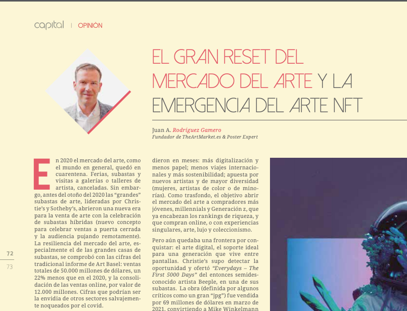 Este mes comenzamos, a través de un artículo de Juan A. Rodríguez, fundador de Theartmarket, una colaboración con la revista de actualidad financiera, Capital: de manera mensual haremos un artículo sobre el mercado del arte. En este primer artículo hemos tratado la irrupción del arte NFT y sus récords de ventas. Os dejamos un aperitivo en la foto de debajo, y os planteamos la incógnita con la que cerramos el artículo: ¿cuál será la primera casa de subastas en ofrecer arte NFT a subasta?