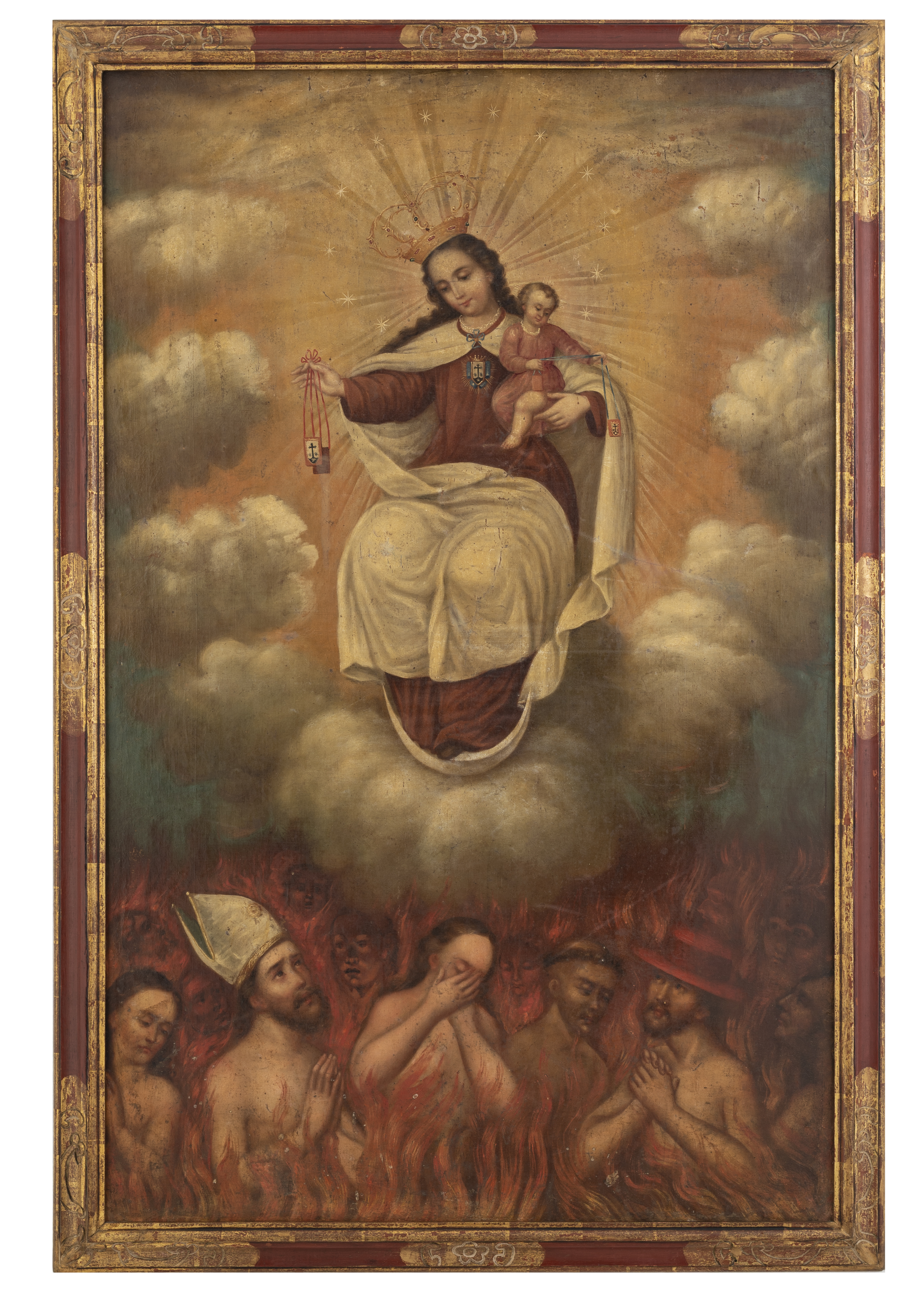 - ESCUELA QUITEÑA. Virgen del Carmen dando el escapulario a las ánimas del purgatorio. Siglo XVIII. Óleo sobre lienzo. 133 x 88 cm. Precio de salida: $ 5.000.000