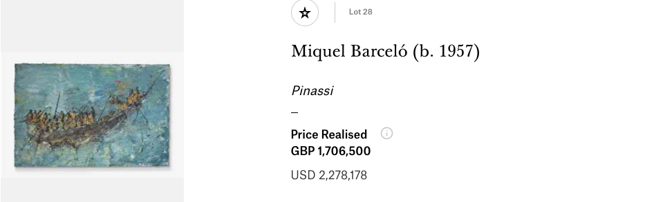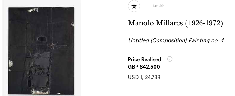 Manolo Millares no fue el único español por el cual se llegó a pujar una cifra millonaria en esa licitación tan jugosa. Esa misma tarde se vendió también el lienzo Pinassi (fechado en 1991, técnica mixta, 198 x 298,2 cm) de Miquel Barceló (1957), el artista español vivo más cotizado. Puesta a la venta por un precio entre 1.000.000 y 1.500.000 libras, la pieza se adjudicó finalmente por 1.706.500 libras (algo más de 2 millones de euros).