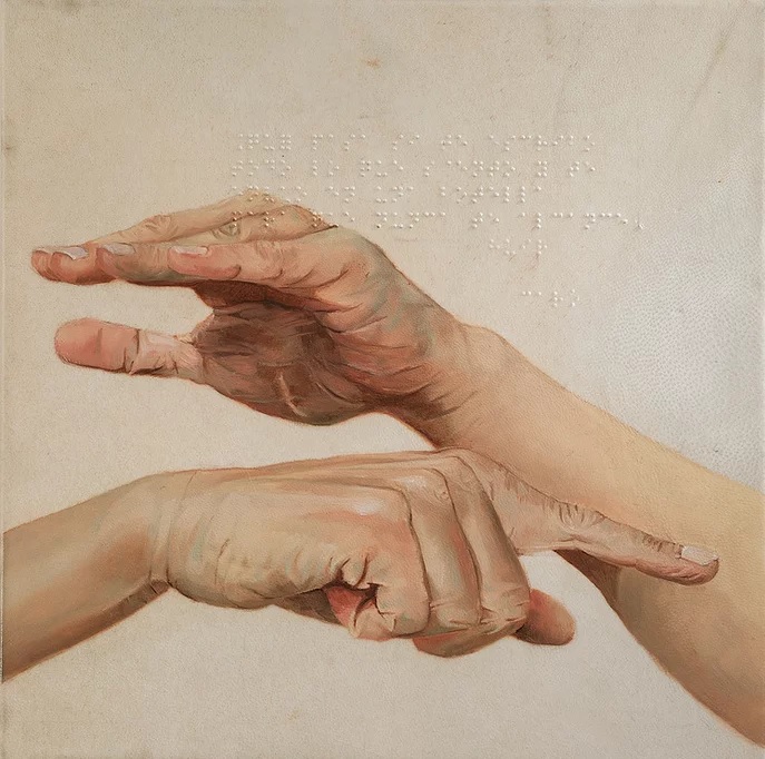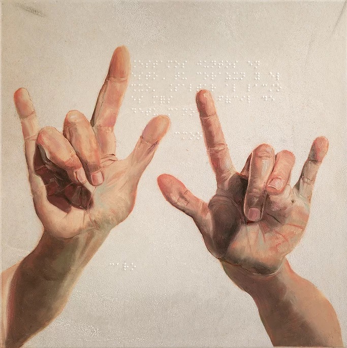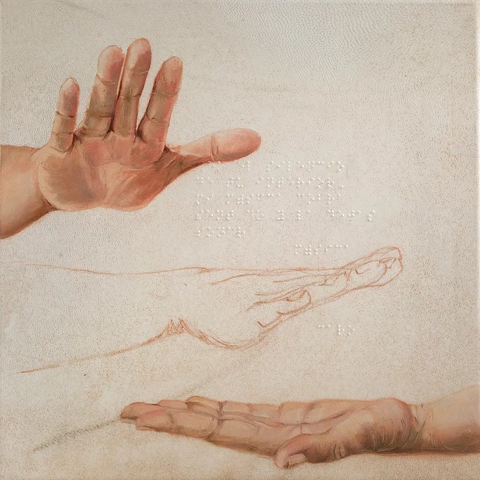 Su trabajo experimenta con diversas técnicas y soportes, como es su colección Skin, titulada así debido a que se realiza en óleo sobre piel de animal, representando unas muy realistas manos en diferentes posiciones. También trabaja con hojas de té en su colección Tea skin, en la que podemos ver varios rostros realizados con este material. Y podríamos decir que The Wink es su serie más intimista, en la que realiza poderosos retratos en óleo. Todo esto sirve para su propuesta conceptual en la que pretende mostrar como actúan las diversas emociones sobre nuestra piel. Esto es algo a lo que da respuesta especialmente en su serie Skin, debido al uso de las imperfecciones del propio cuero, en los que muchas veces podemos ver también textos traspasados a esa piel… en Braille. Porque no pretende que leamos, si no que sintamos, superando el uso de la propia palabra y la visión para transmitir sensaciones en el arte.