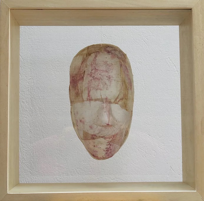 - Piel de té rojos. Papel de té, técnica mixta. 42 x 42 x 15 cm. Obra de Carolina Gutiérrez, de su serie Tea Skin.