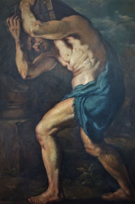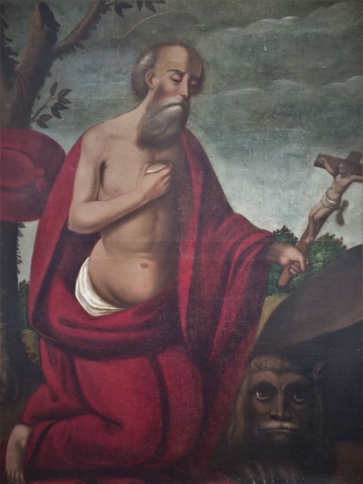 En cuestiones de pintura antigua también tenemos lotes que mostraros. Son ambos de Escuela española del siglo XIX y XVI, en unas similares características. El primero representa a Sísifo, en un óleo sobre lienzo de gran formato (104 x 146 cm) que viene enmarcado. El marco está dorado en oro fino de gran calidad, y parece que está inspirado en el Sísifo de la serie de las Furias de Tiziano. El segundo representa a San Jerónimo Penitente y parece que pertenece al siglo XVI. Es también un óleo sobre lienzo en gran formato (85 x 104 cm). Fue reentelado y restaurado a principios del siglo pasado y presenta una trenza dorada de mediados del siglo XIX.