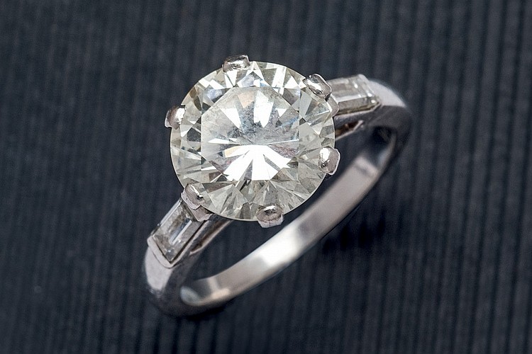 As for the jewelry itself we have four outstanding lots, two necklaces, some earrings and a magnificent ring. We have a large 18K white gold necklace, with three emerald cut sapphires, trimmed with trapeze cut diamonds and diamond studded links, by Duran. The total weight of the diamonds of 9.73 cts and goes to auction for € 25,000 (see). The second necklace is a large 18K white gold Rivière necklace with diminishing diamonds. The total weight is 18 cts, and goes to auction for 14,000 € (see). Platinum ring with diamonds of 4.21 cts flanked by diamonds in baguette cut, going on auction for € 18,000 (see). Finally, the earrings are made of platinum, by Van Cleef & Arpels New York, with blue sapphires in oval cut, bordered with diamonds, signed and numbered, which go on sale for € 12,000 (see).