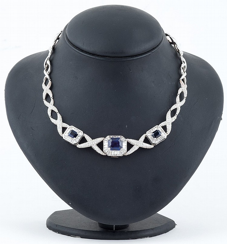 - Lote 221: Large 18K white gold necklace, with three emerald cut sapphires