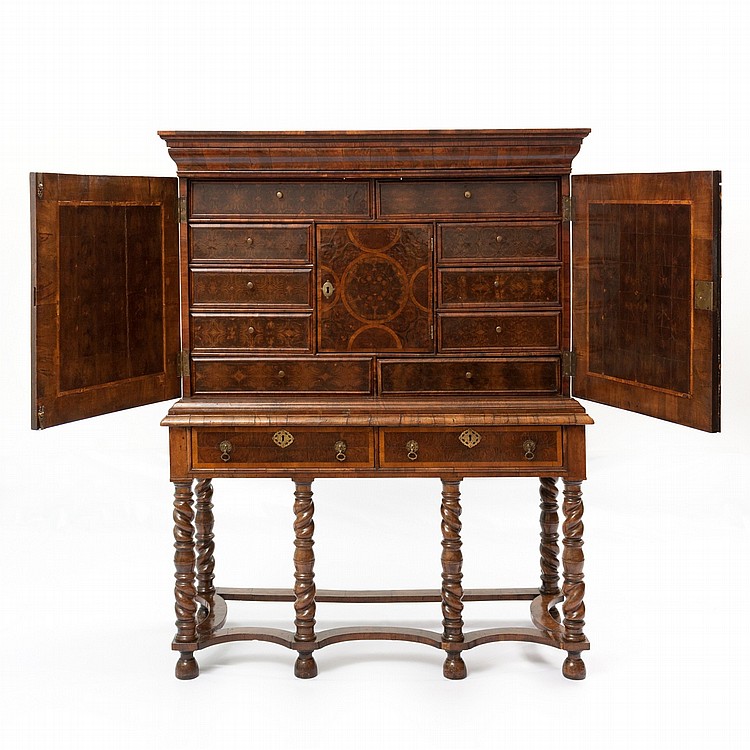 Dentro del ámbito del mobiliario hay tres opciones destacadas. El primer lote es el 839, un cabinet con mesa (165 x 133 x 53 cm) en madera de nogal, abedul y raíz con decoración geométrica, de la época William and Mary en Inglaterra (siglo XVIII). El precio de salida es de 6.000€, como vemos aquí. Por otro lado, vemos un mueble tocador con espejo basculante (época de Fernando VII, primer cuarto del siglo XIX, 250 x 114 x 57 cm) en madera de palosanto y marquetería de boj con decoración vegetal y flores, incluyendo elementos en madera de caoba y copete representando un jarrón de flores con cajón central y cajón en la base. La encimera es de mármol. Sale en 1.200€, como vemos aquí. La tercera pieza que destaca en este ámbito es una consola de madera tallada, lacada y pintada, que representa un busto central con cabezas de león y decoración vegetal, con una encimera de falso mármol. Es estilo Luis XVI, y procede de Italia (siglo XX, 93 x 138 x 60 cm). Su precio de salida es de 750€, y pueden pujar por ella aquí.