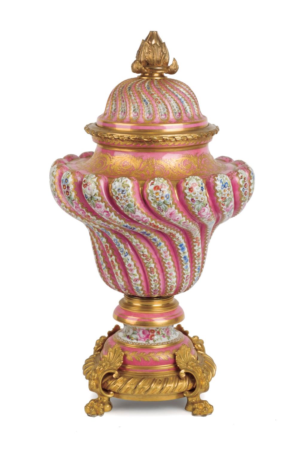 Siguiendo con piezas de gusto francés, presentamos una variedad de jarrones la mayoría realizados en porcelana de la Manufactura francesa Sèvres. El lote 685 se caracteriza por su originalidad. Fechado en el siglo XIX, tiene la base, los adornos y el remate realizados en bronce dorado. El fondo de color rosa Pompadour está decorado con realces dorados y el cuerpo gallonado con decoración floral. Además de jarrones de porcelana francesa, también hay figuras de pequeño tamaño realizadas en porcelana alemana y con el número de lote 691, un centro de mesa de la Manufactura Meissen. Éste sigue los modelos de E. A. Leuteritz y representa una escena recurrente en este tipo de piezas.