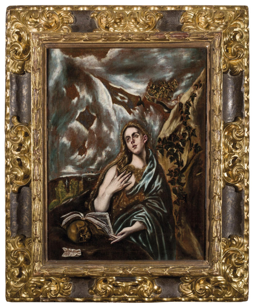 Esta obra es una representación de Santa María Magdalena penitente, un testimonio fundamental de la producción del influyente taller de Doménikos Theotokópoulos, El Greco, durante las primeras décadas del siglo XVII en Toledo. La obra se inscribe en un repertorio iconográfico de gran éxito devocional, revelando una profunda espiritualidad heredada del manierismo tardío. El lienzo presenta un notable estado de conservación, coherente con su antigüedad y con un craquelado estable. Ha sido objeto de una intervención documentada que ha respetado su integridad.Su historia está respaldada por diversas fotografías de época (Archivos Mas y Moreno) que documentan la existencia previa de una inscripción en latín, “Domenicus Greco fecit”, en el ángulo inferior izquierdo. Esta inscripción fue, presumiblemente, eliminada durante un proceso de limpieza entre 1931 y 1950. Una oportunidad única para adquirir una pieza histórica que conecta directamente con la evolución del Manierismo español y el legado de una de las figuras más importantes del Siglo de Oro, a través del pincel de su continuador.