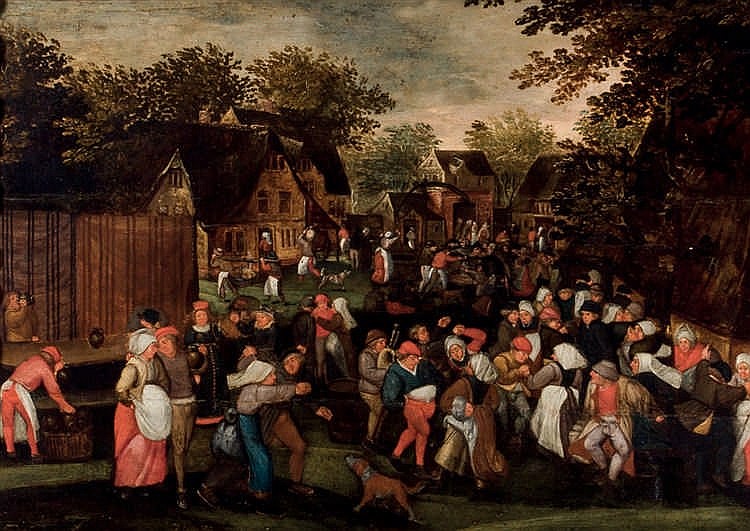 La segunda es el lote 105, El baile de boda, un óleo sobre tabla que probablemente pertenezca a un seguidor de Pieter Brueghel el Joven, del siglo XVII. La temática proviene de un grabado de Pieter van der Heyden, algo harto habitual en las obras de este período. El grabado, como técnica de expresión que permitía la copia y difusión rápida de lo representado, fue la rama artística que más viajó y promulgó los nuevos temas por Europa. No es de extrañar, por tanto, que muchas obras de los siglos XVI y XVII se difundieran gracias a este método. En este caso, dicho grabado llegó a Pieter Brueghel el Viejo y de sus manos a las de su hijo, que realizó varias versiones del mismo, llegando obviamente a ojos y manos de su taller y de sus seguidores. En este caso encontramos una versión algo diferente, al incluir el pueblo y el bosque al fondo de la escena. Su precio de salida está fijado en 19.000€ y pueden pujar por esta obra aquí.