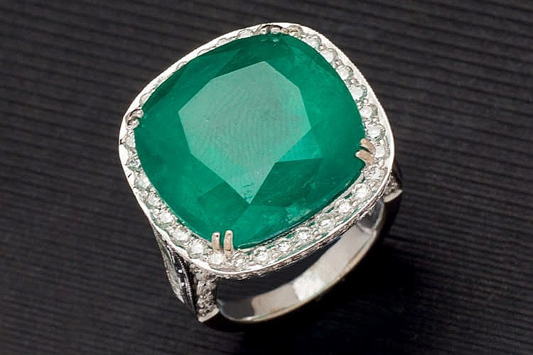 El lote 414 es una sortija de oro blanco de 18 K con una esmeralda colombiana de gran tamaño, talla cojín, de 25,68 cts, con montura y orla de brillantes, 3,35 cts. El lote 413 (1.700€) y el lote 415 (22.500€) van a juego: collar y pendientes. Su precio de salida está fijado en y pueden pujar por ella aquí.