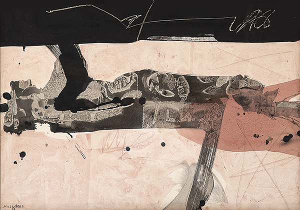 En cuanto a artistas españoles, había buenas referencias en esta subasta. De Manolo Millares encontramos Hombre caído (51 x 72 cm), un óleo sobre papel que se adjudicó en su salida, 30.000€. Sin embargo, la otra obra del artista que salía a subasta y que había llegado incluso a ser portada de catálogo no obtuvo buenos resultados: se trataba de Figura caída (69 x 98 cm), y salía por tan solo 2.000€ más. Quedó desierto. Le acompañaban en esta subasta buenos artistas como Joan Hernández Pijuán y su obra Tres fulles sobre negre (130 x 100 cm), por prácticamente el mismo importe que se vendió en esta misma sala en 2006, 35.000€. Eso sí, no podemos apreciar una gran evolución en sus precios o su estimación visto lo visto. Nuevamente encontramos desierto a Antoni Tàpies, que presentaba dos obras: Sin título (27 x 39 cm), un pintura sobre cartón que salía en 12.000€; y Empremtes de fulla (112 x 66 cm), un óleo sobre lienzo, que salía por 54.000€.