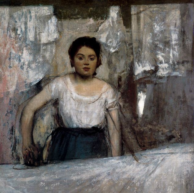 En esta época, y algo que era poco habitual en su obra al no salir de sus fronteras sociales, Degas empezó a pintar un tema con gran frecuencia: las planchadoras. La sociedad de la época y las representaciones que había hasta el momento, las mostraban como mujeres “livianas”, que por falta de recursos se veían obligadas a prostituirse. Sin embargo, Degas aporta un ambiente mucho más cálido a esta representación. La Planchadora, es un retrato conmovedor y finamente ejecutado con tonos blancos, grises y rosas pálidos.