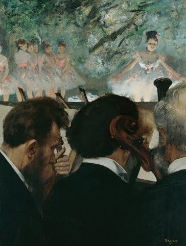 Degas, mientras copiaba a los grandes maestros italianos, realizaba una programa para la representación impresionista de la vida contemporánea. Comenzó sus notas en 1859 pero no fueron publicadas hasta 1921. Estas notas, contenían una lista de temas que era necesario estudiar: músicos, locomotoras, humo de cigarrillos, bailarinas… todo ello, aparece más tarde en su obra. Los primeros lienzos que dedicó a los temas de la vida moderna también hicieron que la modernidad contagiara su ejecución. Como ya hemos comentado, utilizaba puntos de vista y composiciones inusuales. Músicos en la orquesta, es una de estas representaciones.