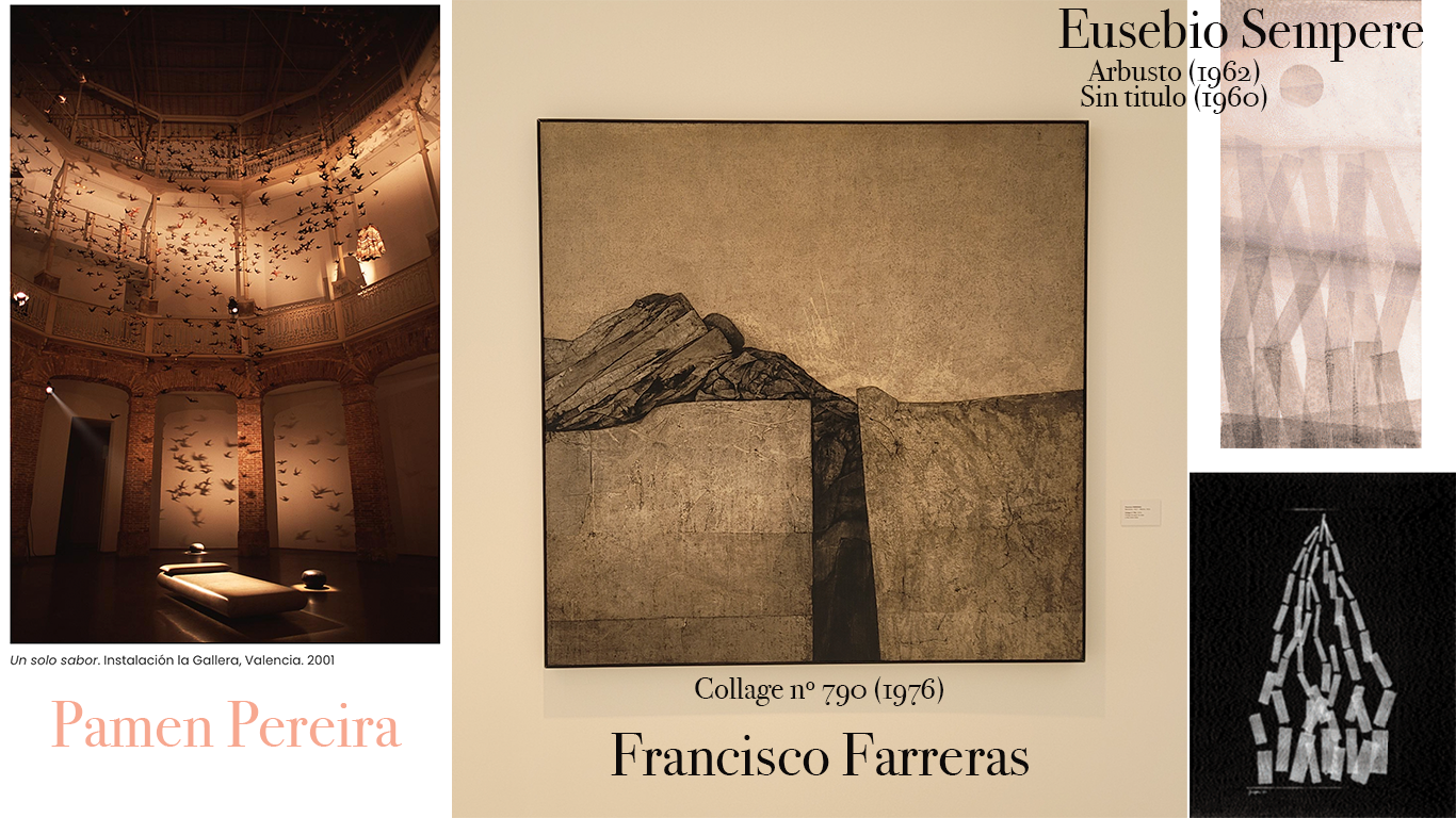 Arbusto (1962), Gouache sobre tabla, de Eusebio SempereCollage nº 790 (1976) collage de seda y óleo sobre tabla, de Francisco Farrera