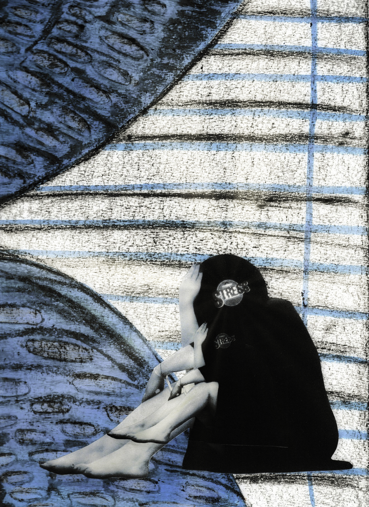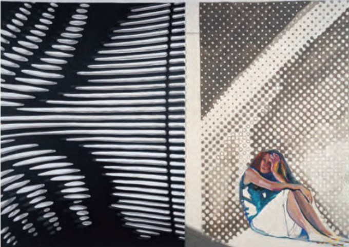 También me inspiró su diálogo en el espacio expositivo con su “vecina” de enfrente, “La brisa le defiende con su magia” de Soledad Sevilla. La cierta angustia que me transmitió la figura pensativa femenina se iluminó de esperanza al girarme y ver esa puerta a la magia de la obra de Sevilla. Como en mis obras suelo incluir un toque de esperanza, lo vi claro.