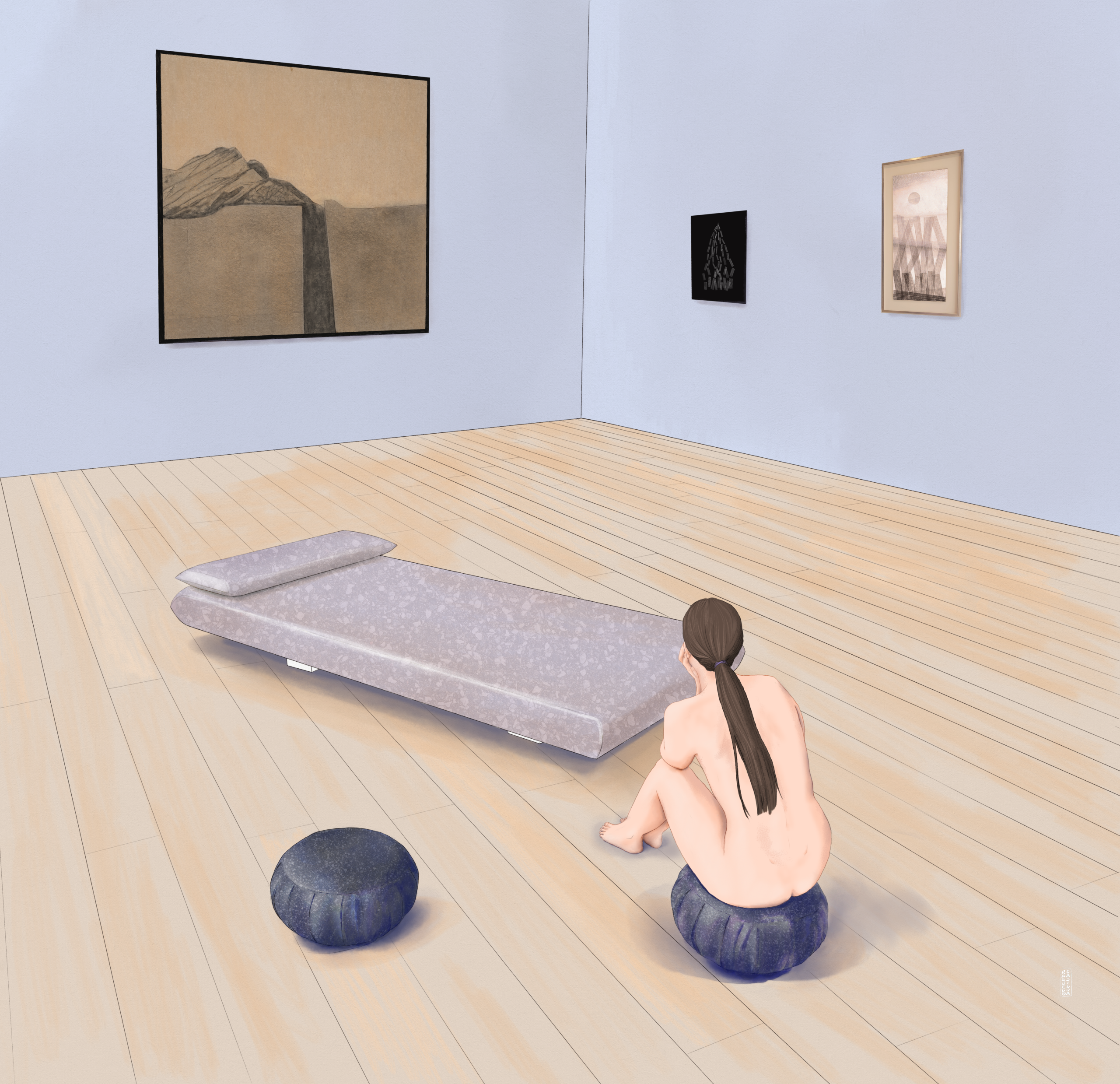 To pay homage to Maca, I haven’t chosen just one work but I wanted to digitally create an illustration of one of his rooms in which I have placed my favourite works from the museum, the ones that touch my soul and most connect with me and my work as an artist, in this illustration I want to try to transmit the peace and stillness that the simplicity of these works transmits to me. They are all very ‘Zen’, inspired by the minimalism of the elements, the essence of nature and things.for this room, I have played at being a ‘curator’ of what soothes my soul. I would love to be able to live with these works for a while, hence the reason for my illustration.