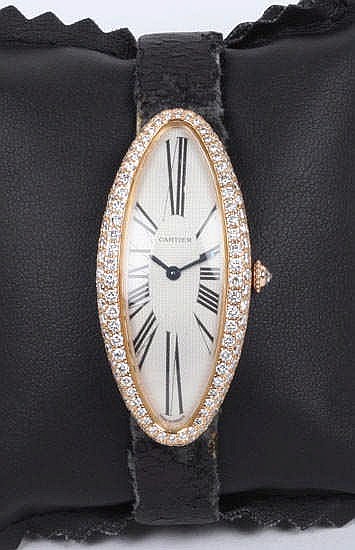 En cuanto a relojes de señora encontramos varios relojes de la marca Cartier, como este reloj-joya en caja oval, curvada (23 x 50 mm), realizado en oro amarillo con orla en pavé de diamantes en talla brillante. El movimiento es mecánico, con carga manual, y la esfera plateada con agujas de acero azul. Su precio de salida es de 7.000€ (ver). O, también de Cartier, otro reloj-joya modelo “Santos 100”, en caja cuadrada (33 mm) de oro blanco con orlas de pavé de diamantes talla brillante. La esfera es plateada y tiene numerales romanos y un segundero central, cuya corona hexagonal está decorada con un brillante. Su precio es de 9.000€ de salida (ver). Por último respecto a Cartier, el tercer reloj-joya que destacaremos hoy aquí, con caja oval (55 x 20 mm), de oro blanco con una orla de pavé de diamantes en talla brillante, con movimiento de cuarzo. La pulsera es original, de piel forrada de color rosa claro, con hebilla. Saldrá a subasta por 6.000€ (ver).