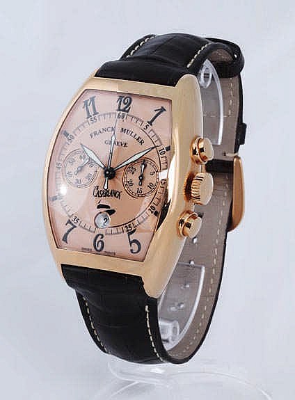 Entre la selección de relojes encontramos algunos claramente destacados. No puede faltar la imagen principal del catálogo, un fastuoso Frank Muller “Master of Complications” modelo Casablanca, nº3/25. Es un cronógrafo suizo, con caja de barrilete de oro (40 x 50 mm), con movimiento automático y una pulsera de piel marrón. La esfera, particularmente estética, es de color salmón con dos contadores y un calendario a las seis. Sale a subasta por 7.000€ (ver).
