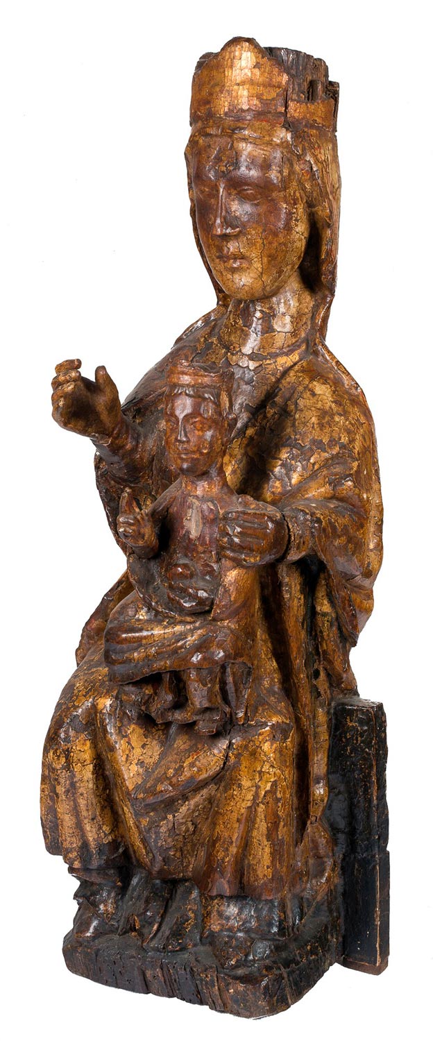 - Lote 16: Virgen en Majestad “Sede Sapientiae”, finales del siglo XIII, escuela catalana. 77 x 27 x 20 cm. Precio de remate: 18.000€