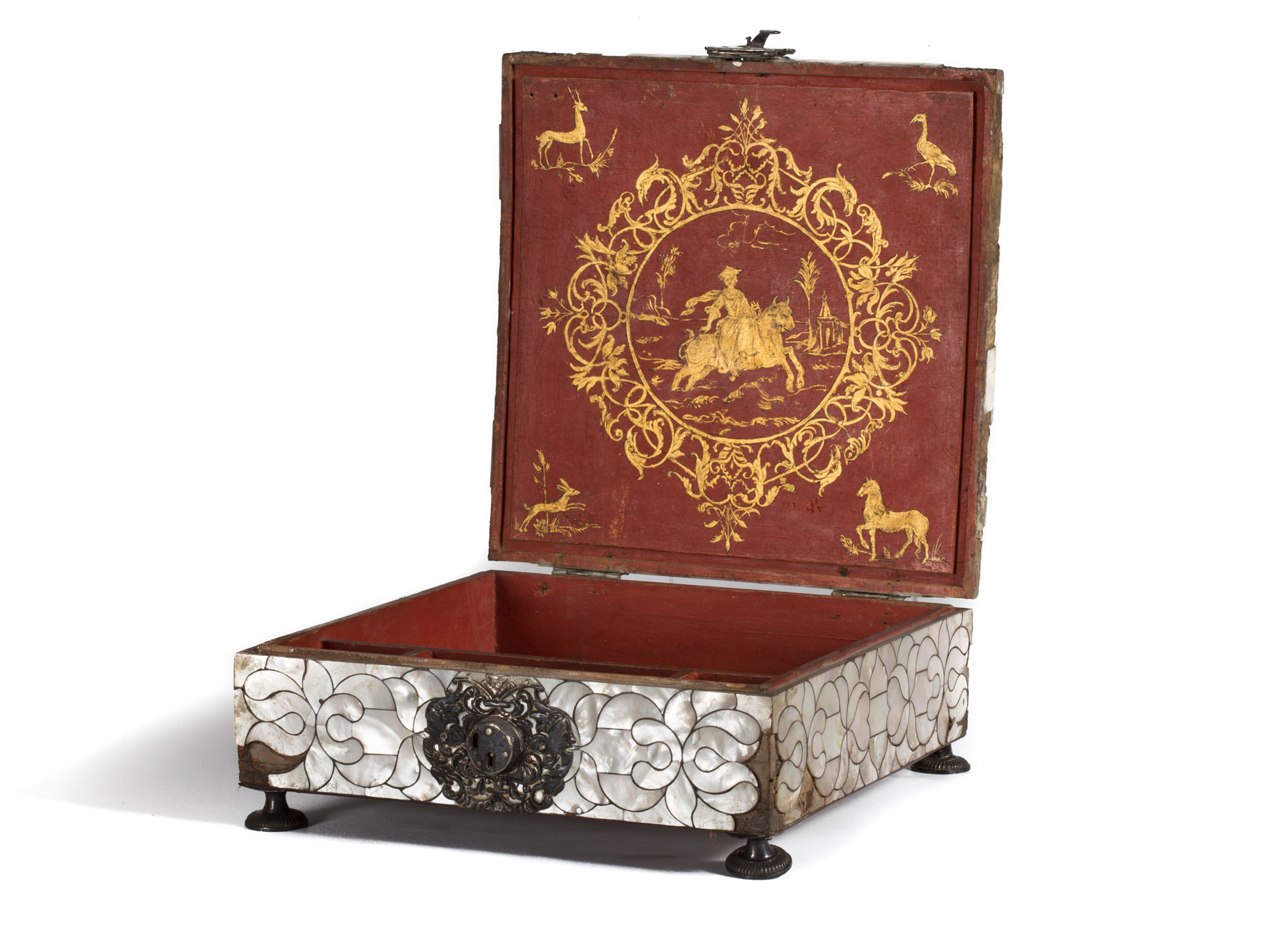 - Lote 1026: Cofre “enconchado” mexicano o peruano, S. XVIII. 13 x 36 x 37 cm. Precio de remate: 22.500€