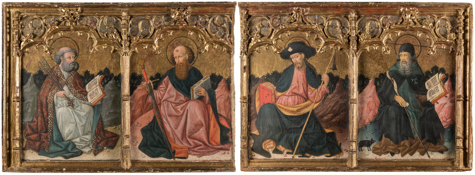 - Lote 345: Anónimo de la Corona de Aragón c.1500, San Pedro, San Pablo, Santiago y San Antonio Abad. 88 x 244 cm. Precio de remate: 90.000€