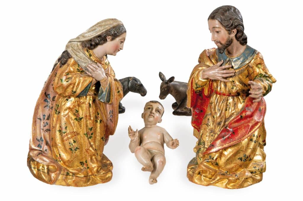 - scuela Colonial Novohispana Capitanía General de Guatemala, S. XVIII “Misterio” Grupo escultórico en madera de cedro tallada, policromada, dorada y estofada