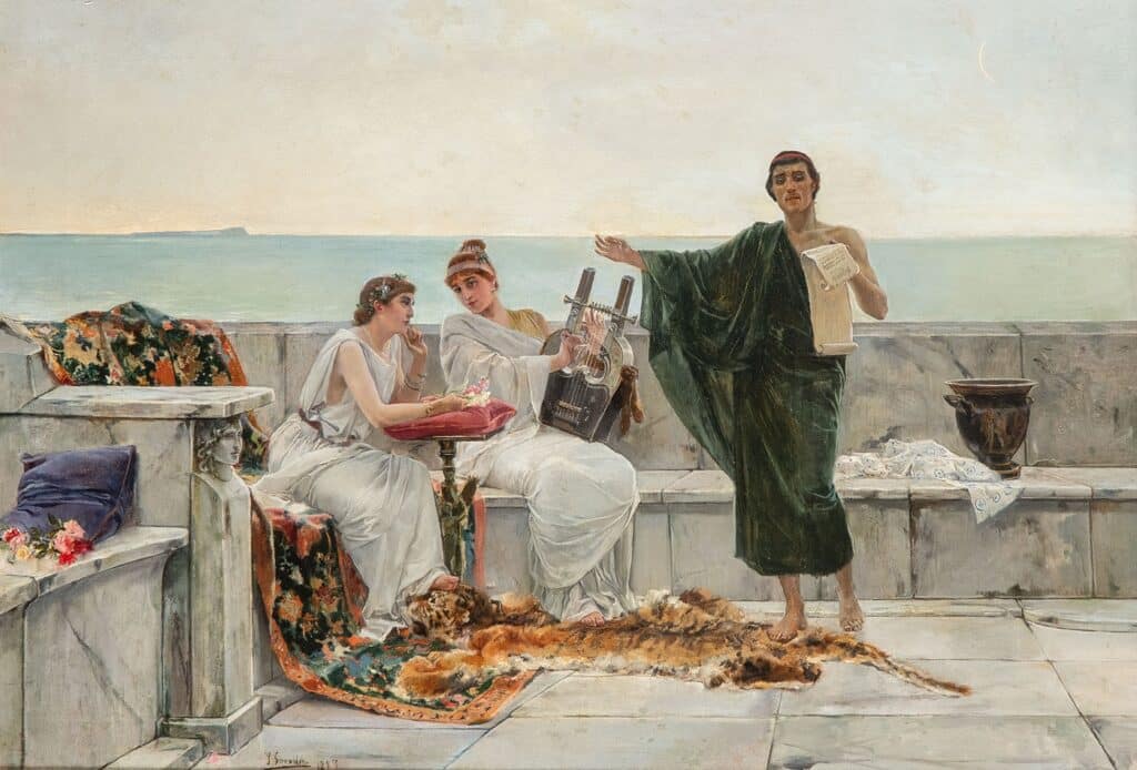 Joaquín Sorolla, Escena romana (Lote 140). Pintada al final de su estancia en Roma (1889). Identificada previamente como Marco Antonio y Cleopatra, se sugiere que es una interpretación de Lectura de Homero de Lawrence Alma-Tadema. Dada la escasez de obras de este período en colecciones museísticas, se considera una posible adquisición de interés para el Estado.