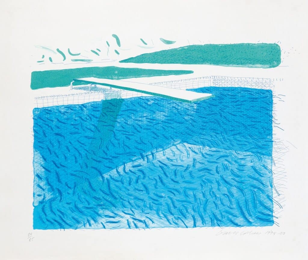 David Hockney, Lithographic Water Made of Lines, Crayon and Two Blue Washes (Lote 605, Litografía, Ed. 84/85). Obra del artista vivo más cotizado. Un ejemplar anterior de la misma serie se vendió recientemente por 105.000 euros (126.600 euros con gastos), sugiriendo un fuerte potencial de revalorización en la puja actual.