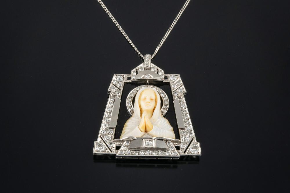 - Lote 111: Medalla Art Decó con representación de la Virgen con vestido de nácar sobre placa de ónix. Precio de salida: 1.500 euros.