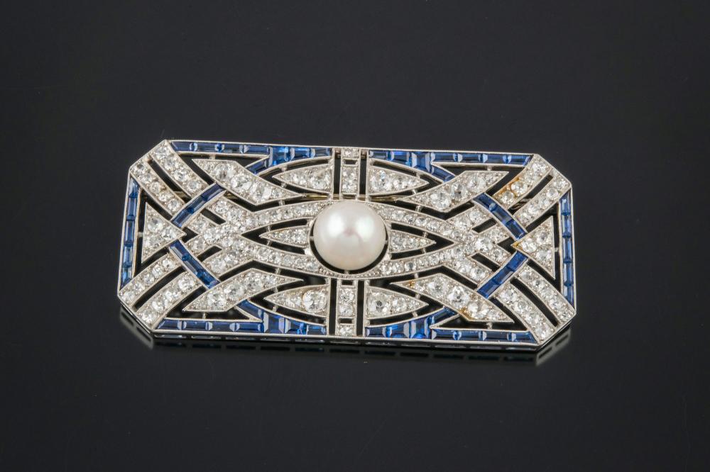 - Lote 110: Broche estilo Art Decó decorado con motivos de cintas entrelazadas de diamantes talla brillante. Precio de salida 3.500 euros.