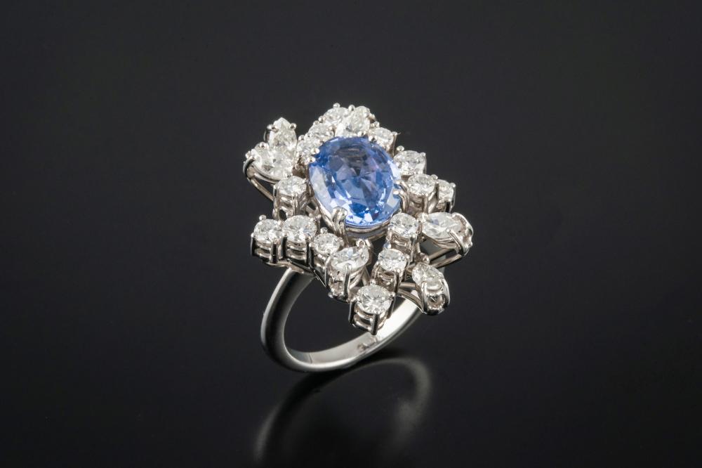 - Lote 191: Sortija de zafiro central talla oval con orlado de diamantes talla brillante y marquise. Precio de salida: 1.800 euros.