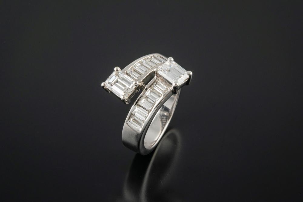 - Lote 229: Sortija tipo tu y yo realizada en oro blanco con diamantes talla esmeralda y baguette. Precio de salida: 5.000 euros.