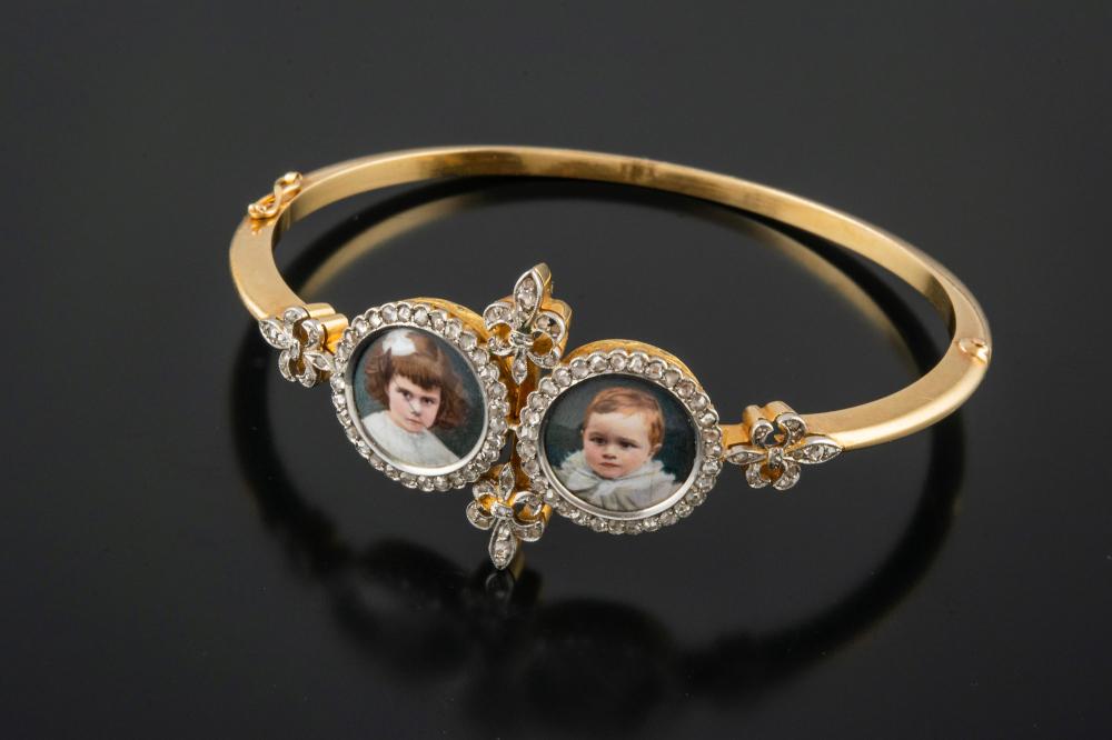 The lot 234 describes a ring composed of a ring in yellow gold and two rings in white gold with diamonds brilliant cut with an approximate weight of 0.16 carats. The base price will be 500 euros (view). In the last outstanding lot, the number 286, a rigid bracelet made with gold and platinum views. As a central decorative motive, we find four lis-flowers and two enamels representing two children accompanied by rose cut diamonds with an approximate weight of 0.65 carats. The total weight of the bracelet is 16.8 grams. The base price is 600 euros (view).