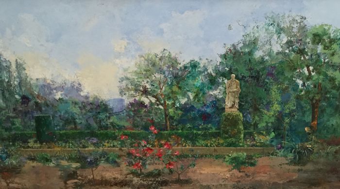 En este caso, las ofertas de Catawiki son claras. Se habla de arte contemporáneo y clásico, aunque bastante centrado en realidad en los siglos XIX y XX. El lote principal y destacado es Rincón del jardín botánico (150 x 60 cm), de Ángel Pintado Sevilla, una obra en óleo sobre lienzo sobre panel, que viene firmada al dorso y enmarcada con una moldura lisa al oro viejo. Es un artista destacado del Realismo contemporáneo con una pincelada muy personal, con reminiscencias del siglo XIX que enlazan con el Arte Realista actual. Entre los temas que trata, se repiten constantemente las naturalezas muertas y los paisajes, cómo el lienzo de gran formato que subastan esta semana.