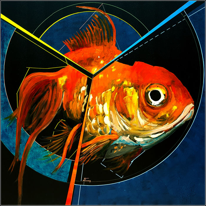 Y por último, tenemos a Jesús Manuel Moreno con su obra Familia numerosa (100 x 81 cm), de la colección “La línea blanca”, de la cual hemos tenido oportunidad de ver alguna obra más en Catawiki. Es un óleo sobre lienzo en bastidor, sin marco. De Jesús Fernández Escobar vemos Carassius Auratus (130 x 130 cm), una técnica mixta sobre lienzo de este mismo año, firmado en el frontal.