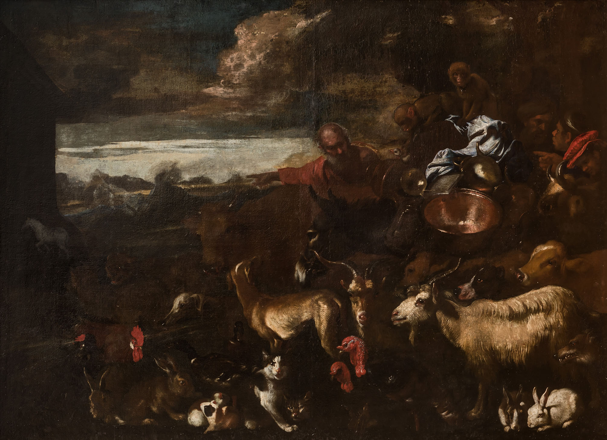 BENEDETTO CASTIGLIONE, GIOVANNI. Noé conduciendo los animales al arca. Óleo sobre lienzo. Precio de remate: 16.000€
