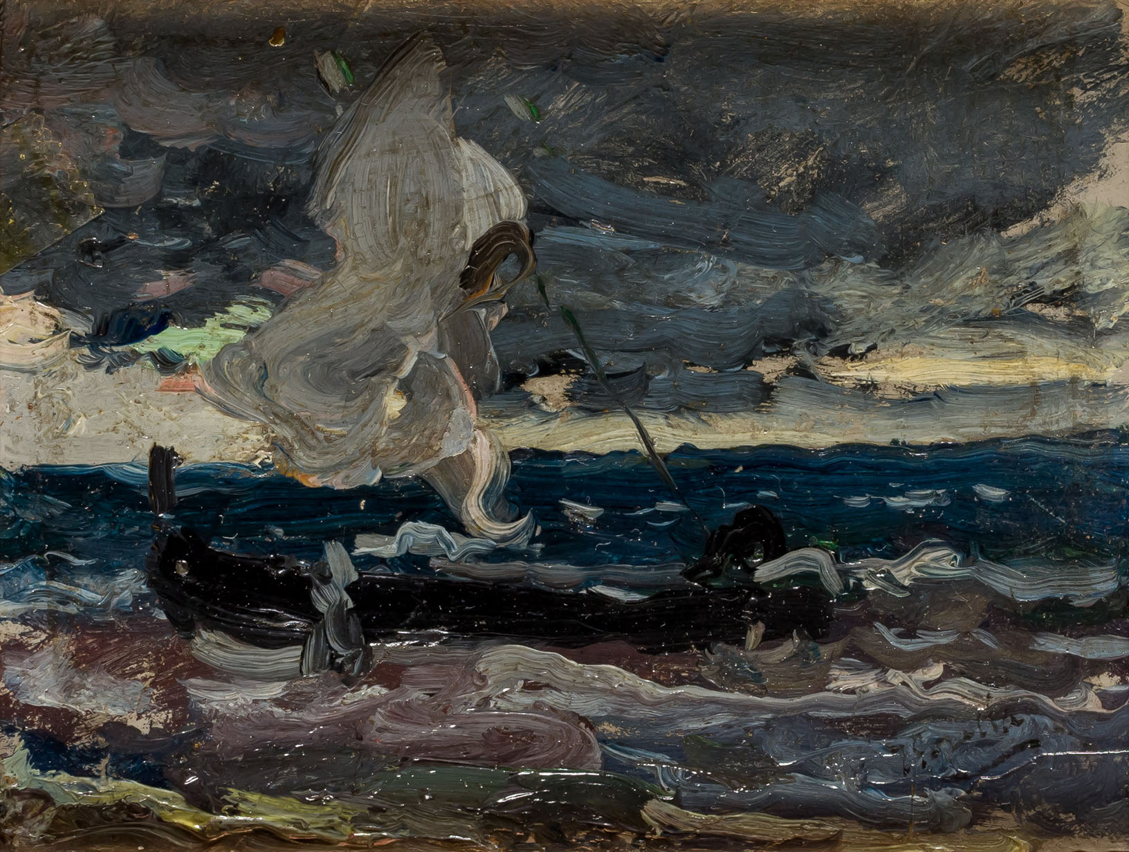 SOROLLA, JOAQUÍN. Barca al atardecer, Playa de Valencia. Óleo sobre tabla. Precio de remate: 12.000€