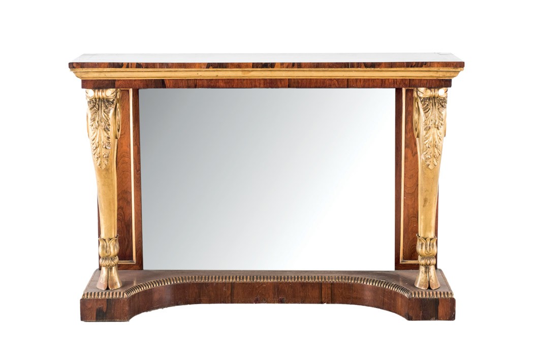 - Consola de palosanto de aproximadamente 1900 con trasera de espejo, patas frontales doradas y talladas. Remate: 2.250€ en Durán