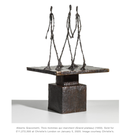 - Alberto Giacometti, Trois hommes qui marchent (Grand plateau) (1950). Sold for £11,272,500 at Christie’s London on January 5, 2020. Image courtesy Christie’s.