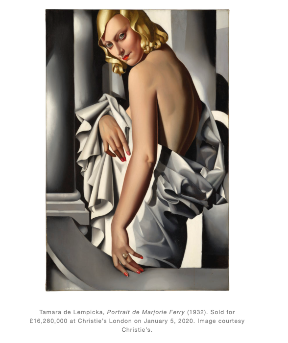 - Tamara de Lempicka, Portrait de Marjorie Ferry (1932). Sold for £16,280,000 at Christie’s London on January 5, 2020. Image courtesy Christie’s.