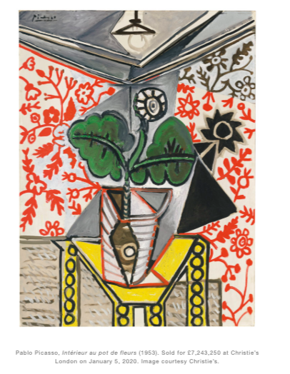 - Pablo Picasso, Intérieur au pot de fleurs (1953). Sold for £7,243,250 at Christie’s London on January 5, 2020. Image courtesy Christie’s.