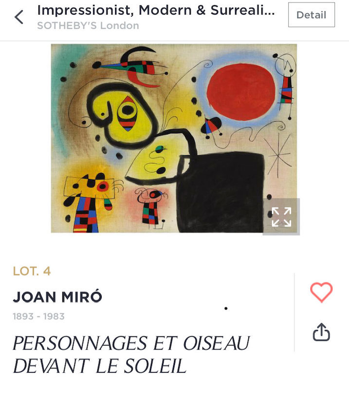 - Joan Miró PERSONNAGES ET OISEAU DEVANT LE SOLEIL Estimate 1,500,000 — 2,000,000 GBP LOT SOLD. 2,415,000 GBP