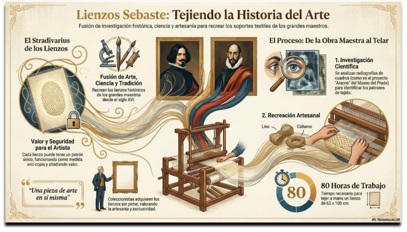 R. Los lienzos de autor Sebaste son soportes pictóricos textiles artesanales, creados a partir de la investigación de las telas originales utilizadas por los grandes maestros de la pintura desde el siglo XVI. No son lienzos industriales,sino telas únicas, fieles a la tradición histórica, pensadas para diferentes destinatarios. Por un lado, artistas que buscan autenticidad, calidad y una base material con valor cultural. Hoy es posible pintar en los mismos lienzos que utilizaron los grandes maestros, pero la misma técnica permite que cada artista pueda optar también a un lienzo tejido con un patrón único y exclusivo, imposible de falsificar y que aumente el valor de su obra al generar una “rareza” en su catálogo, algo muy apreciado por los coleccionistas y casas de subastas.