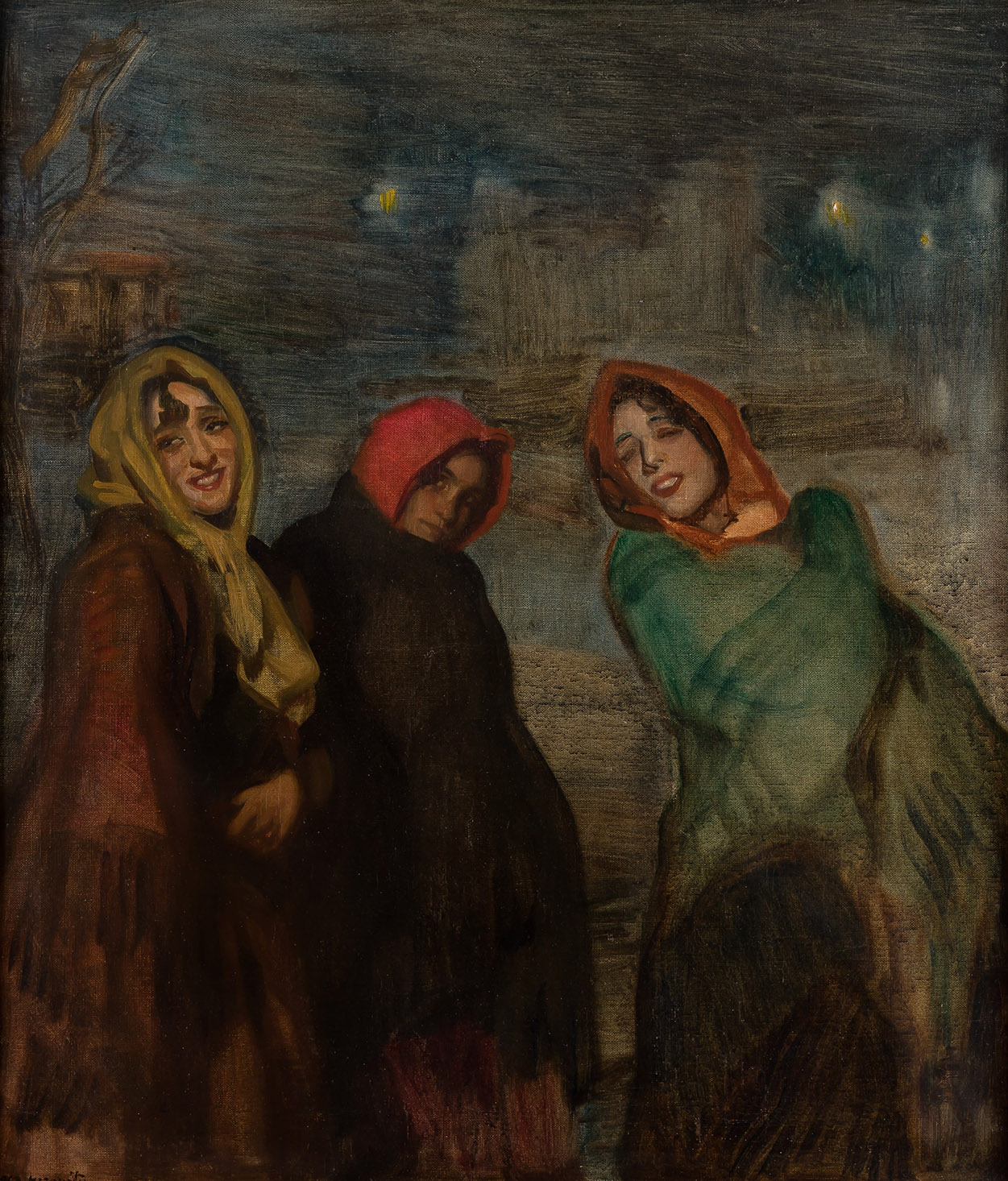 - LÓPEZ MEZQUITA, JOSÉ MARÍA. Tres jóvenes en la noche. Óleo sobre lienzo. 77 x 65 cm. Precio de remate: 10.000€ (Ansorena)